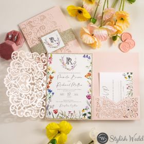 Monogrammed Modern Chic Boho Bright Wildflower Wedding Invitation With Classic Blush Pocket Swws359