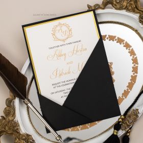 Modern Black Pocket Wedding Invite With Gold Monogram Design Swwp003