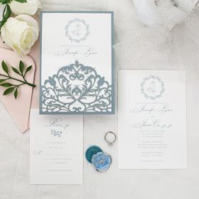 Modern Dusty Blue Monogram Laser Cut Panel Pocket Wedding Invitations Swwp001