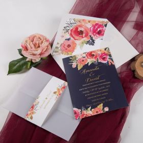 Romantic Navy Blue And Floral Coral Wedding Invitation With Vellum Paper Pocket And Belly Band Swpi014