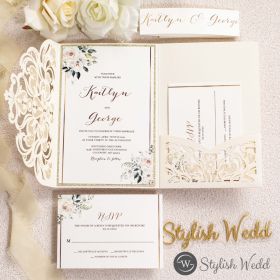 Ivory Laser Cut Pocket Wedding Invitation With Floral And Champagne Gold Glittery Backer Swws333
