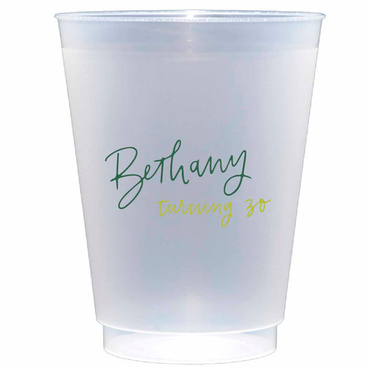 Shatterproof frosted flex cups available in a variety of sizes and ink colors.