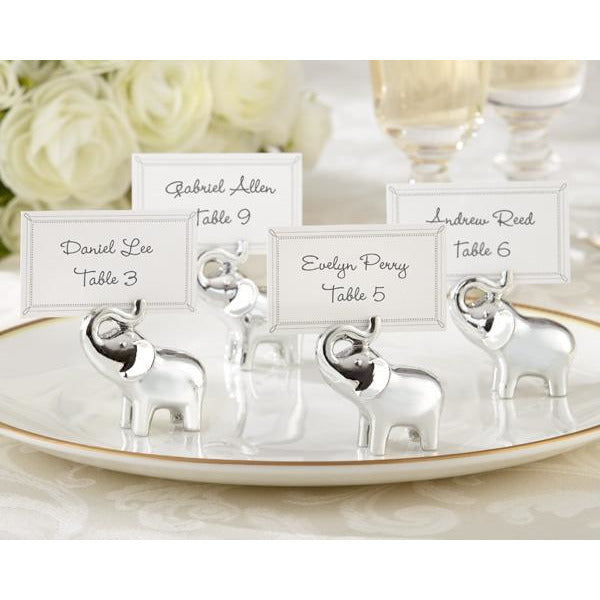 In Eastern cultures, an elephant with its trunk held high symbolizes good luck--something you're wished on your wedding day, and something you wish for family and friends always. Make it a prominent part of your once-in-a-lifetime moment with Kate Aspen's silvery, Asian-inspired lucky-elephant place card/photo holder favor. Features and facts: Charming, silver-finish elephant with raised trunk containing small slit for place card or photo Elephant measures approximately 1 5/8" h x 1 3/4" w x 1 1/8" d Place card included Sold in a set of four Product dimensions: - Weight: 0.50 lbs