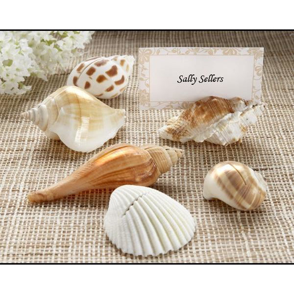 Create the perfect seaside atmosphere by showing your guests to their seats with these beautiful authentic shell holders. Each dainty, shiny shell holds a placecard and guests can later use these keepsake shells to hold their own photos. A perfect memento for seaside events! Sold as a set of 6. Matching designer placecards included. (Because these are real sea shells actual size and shape may vary) Product dimensions: - Weight: 0.37 lbs