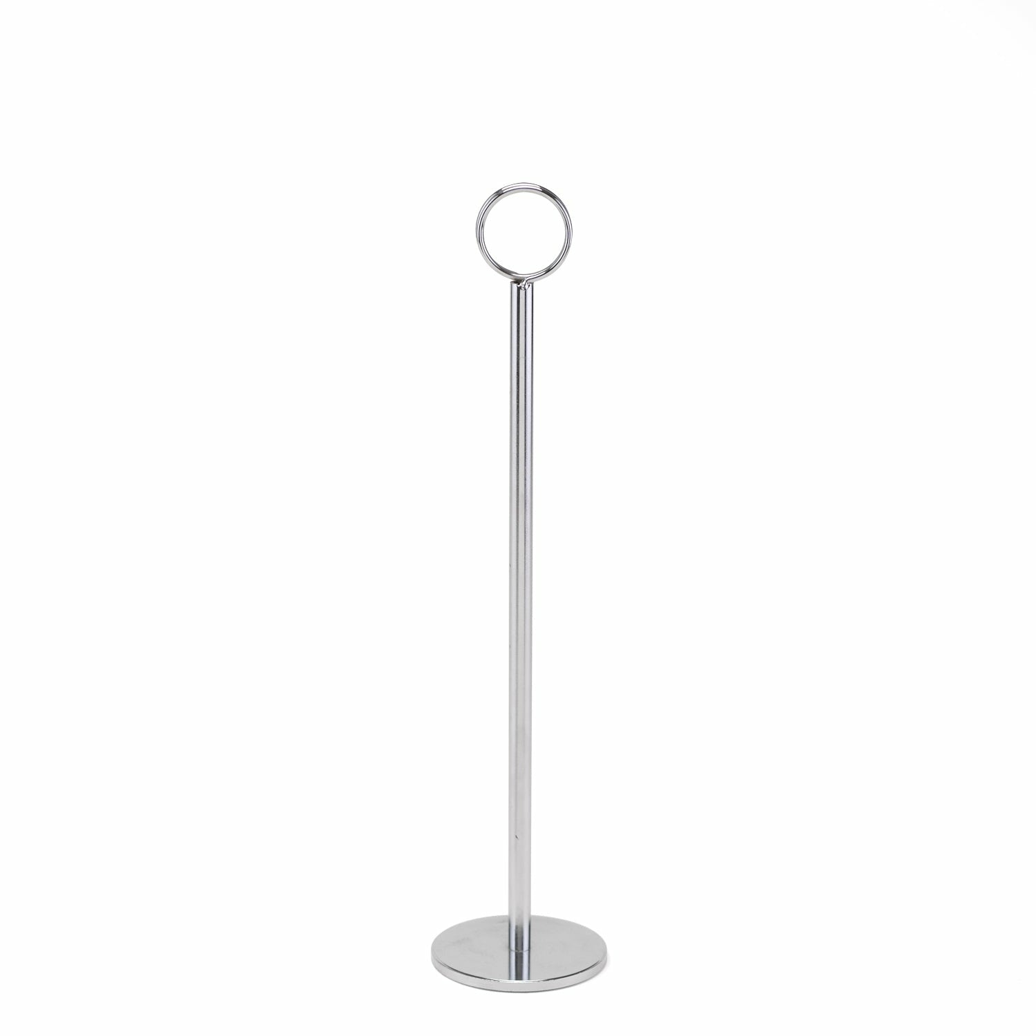 Chrome-plated table number stands with double ring clip. Stands have 2 3/4" diameter base, 3/8" rod and measure 15" high Product dimensions: - Weight: 0.45 lbs