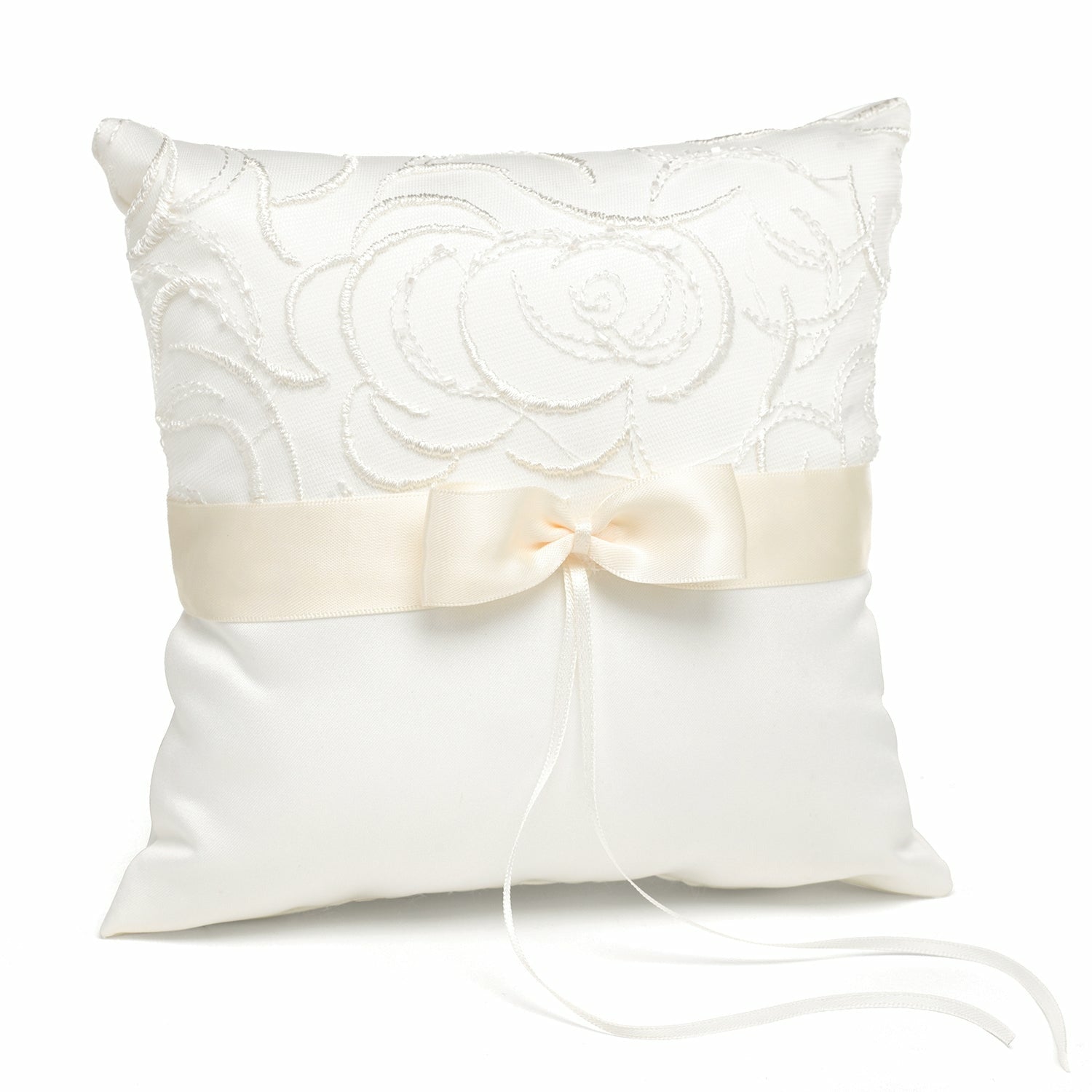 Ivory satin pillow with textured swirl pattern and satin bow. Pillow measures 8" x 8". Product dimensions: - Weight: 0.50 lbs