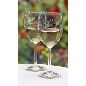 Set of two anniversary wine glasses hold 13 ounces and feature a "25th Anniversary" in silver. Glasses are 8" tall. Product dimensions: - Weight: 1.80 lbs