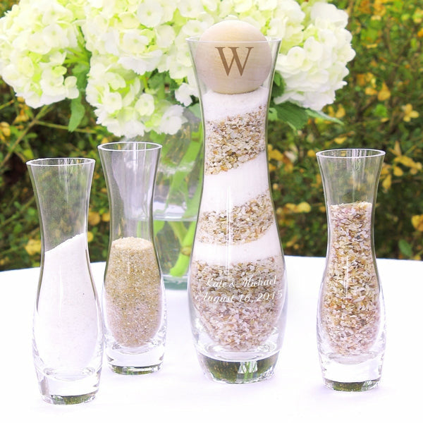 The Personalized Rustic Unity Sand Ceremony Set is a charming alternative to the traditional unity candle. Crafted into curvaceous silhouettes and topped with a stunning wood stopper, it will be the perfect addition to your ceremony. After the wedding, this unity sand piece will be a great keepsake for years to come. Sand not included. FREE Personalization. Set Includes: One (1) large, personalized vase with a ball topper and three (3) smaller vases. Dimensions: Large vase: 10"� L. x 2.75"� W. at opening (2"� W. at base). Holds 18 oz. Small vase: 6.75"� L. x 1.75"� W. at opening (1.25"� W. at base). Holds 5.5 oz. Features: Curvaceously shaped vases, three small and one large, an engraved wood ball stopper, and free personalization. Materials: Glass. Wood.Please note: minor bubbles and swirls are inherent to hand-blown glass. Variations may occur on styles due to their handcrafted nature. Care Instructions: Wipe clean with a damp cloth. Engraving Options: May be engraved with two script custom lines (max of 24 characters per line) on the large vase and a single block initial on the wooden stopper at no additional cost. Product dimensions: