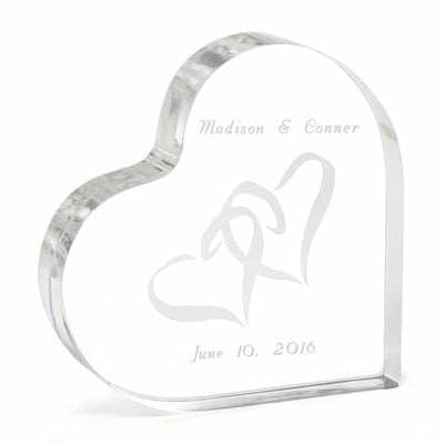 Acrylic cake top features a swish heart design. Engraving style shown is Script Single Line. Product dimensions: - Height: 4" - Base Diameter: 4"