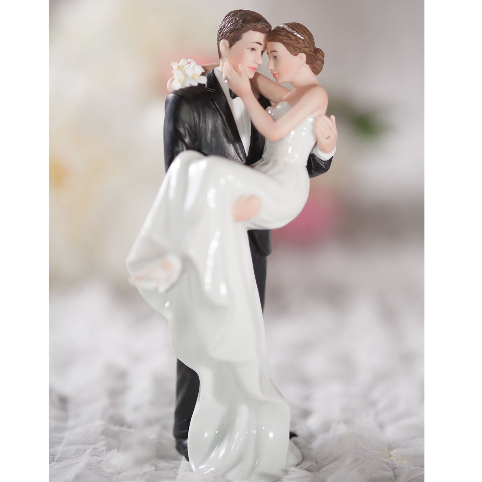 This elegant fine porcelain wedding couple features the bride carrying a delicate handmade bouquet. A perfect addition for your guestbook table, or to crown the top of your wedding cake. Handpainted. Product dimensions: - Weight: 0.40 lbs - Height: 6" - Base Diameter: 2"