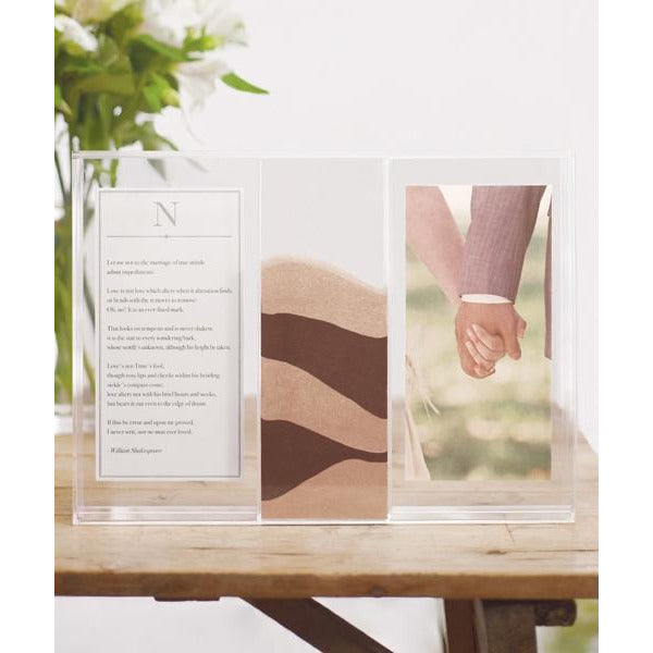 This unique sand ceremony shadow box includes a separate central compartment for the bride and groom to fill with sand as well as two flanking compartments intended to include photos or printed messages that are meaningful to the couple. These printed pieces are simply placed between the two layers of acrylic provided and slid into position. Following the wedding, this will make the perfect keepsake that can be displayed and enjoyed for years to come. Compartment holds 2 bags of sand and the top has a piece that slides in and out to keep sand secure. Colored sand and pouring vases sold separately. Materials: Acrylic Product dimensions: - Weight: 0.95 lbs