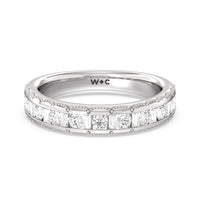 Shimmering pave diamonds cascade down this band to create a timeless beauty that will never go out of style. Designed to be paired with our heritage channel set round and baguette diamonds with peek-a-boo accent engagement ring for a simple and sophisticated look.