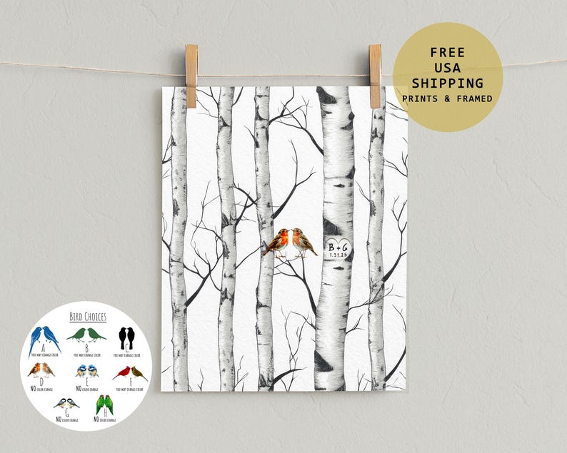 This personalized couple artwork features your initials and special date "engraved" on a birch tree surrounded by two lovebirds symbolizing unity and affection. Each design is customized with your chosen bird pair, making every print a one-of-a-kind expression of love.