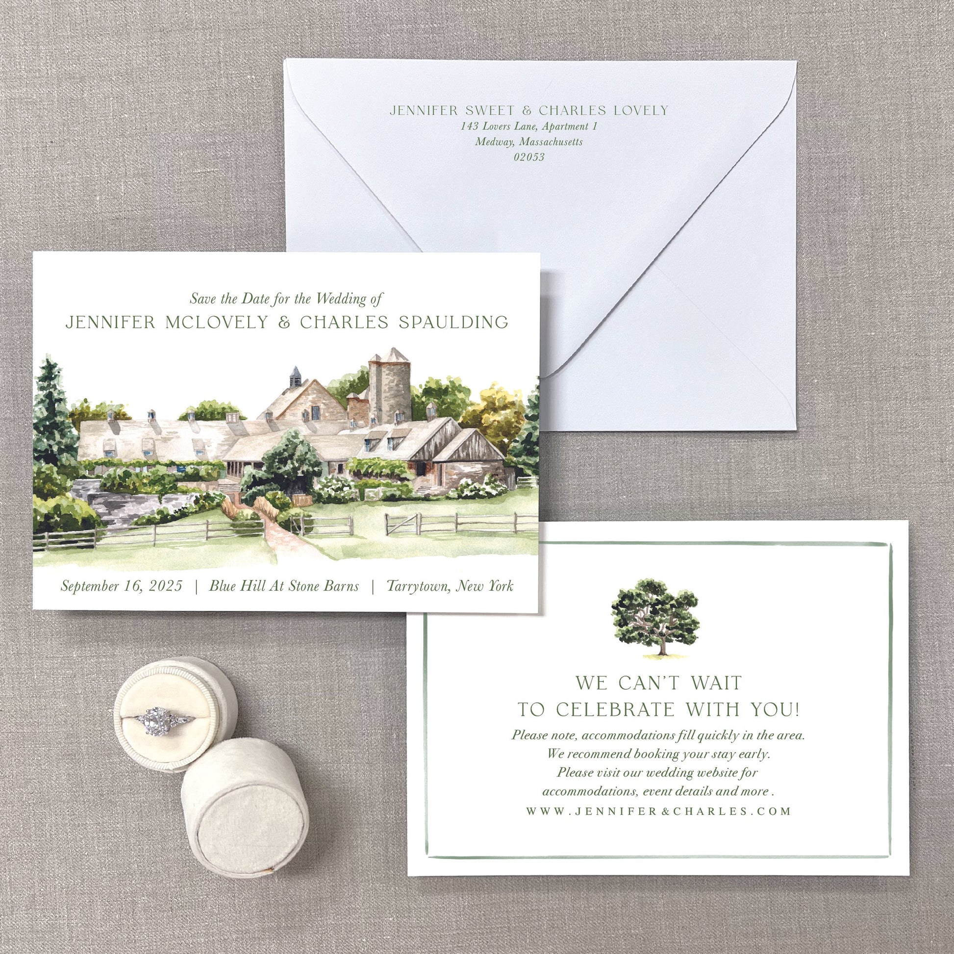 These lovely ladies are ready to order! Blue Hill at Stone Barns, Tarrytown, New York Watercolor Venue Save the Dates are at your door in as soon as 4 weeks . Ready to order save the dates are limited to the quantities and design options listed below. Please note, each layout has been designed to best showcase the watercolor venue and cannot be altered (placement of text, vertical/horizontal orientation etc). THE OPTIONS: Choose your Quantity- Sold in sets of 20, with 40 as the lowest quantity offered. Select quantity from first dropdown option below, leave second quantity at 1 (it indicates the set) Decide if you’d like blank envelopes or to include Envelope Addressing Once those two items are selected, the price above will adjust accordingly DESIGN OPTIONS: Scroll down to view the various options. You’ll indicate your selections in a pop-up form once you click “add to cart” Choose your font Choose your font color Choose your back design details Choose your envelope color