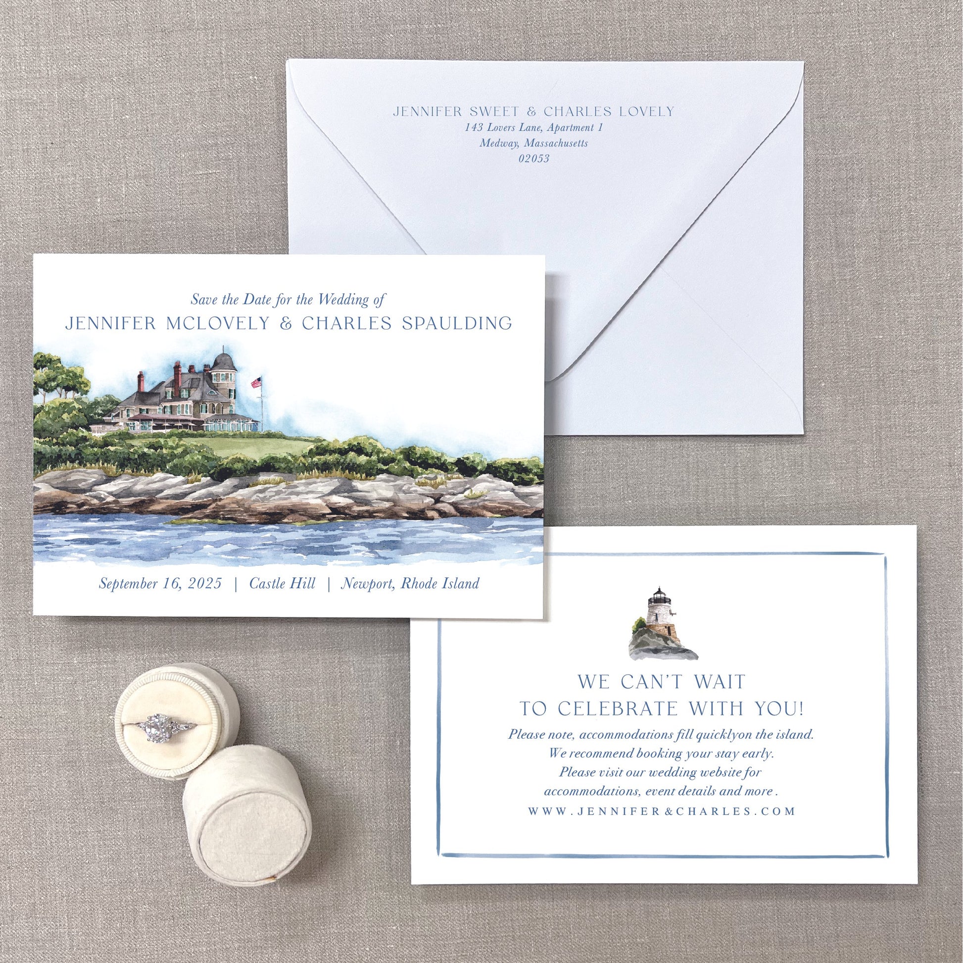 These lovely ladies are ready to order! Castle Hill (Water Scene), Newport, Rhode Island Watercolor Venue Save the Dates are at your door in as soon as 4 weeks . Ready to order save the dates are limited to the quantities and design options listed below. Please note, each layout has been designed to best showcase the watercolor venue and cannot be altered (placement of text, vertical/horizontal orientation etc). THE OPTIONS: Choose your Quantity- Sold in sets of 20, with 40 as the lowest quantity offered. Select quantity from first dropdown option below, leave second quantity at 1 (it indicates the set) Decide if you’d like blank envelopes or to include Envelope Addressing Once those two items are selected, the price above will adjust accordingly DESIGN OPTIONS: Scroll down to view the various options. You’ll indicate your selections in a pop-up form once you click “add to cart” Choose your font Choose your font color Choose your back design details Choose your envelope color