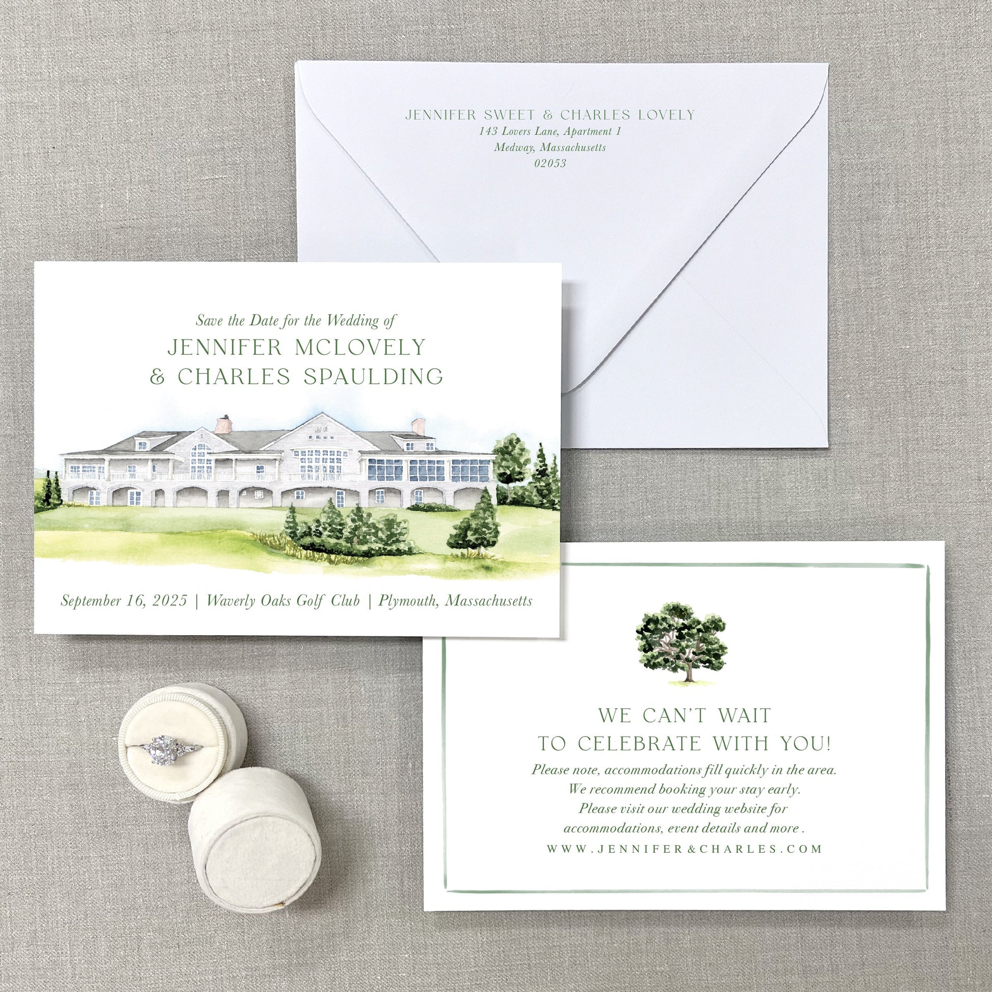 These lovely ladies are ready to order! Waverly Oaks Golf Club, Plymouth, Massachusetts venue watercolor Save the Dates are at your door in as soon as 4 weeks . Ready to order save the dates are limited to the quantities and design options listed below. Please note, each layout has been designed to best showcase the watercolor venue and cannot be altered (placement of text, vertical/horizontal orientation etc). THE OPTIONS: Choose your Quantity- Sold in sets of 20, with 40 as the lowest quantity offered. Select quantity from first dropdown option below, leave second quantity at 1 (it indicates the set) Decide if you’d like blank envelopes or to include Envelope Addressing Once those two items are selected, the price above will adjust accordingly DESIGN OPTIONS: Scroll down to view the various options. You’ll indicate your selections in a pop-up form once you click “add to cart” Choose your font Choose your font color Choose your back design details Choose your envelope color
