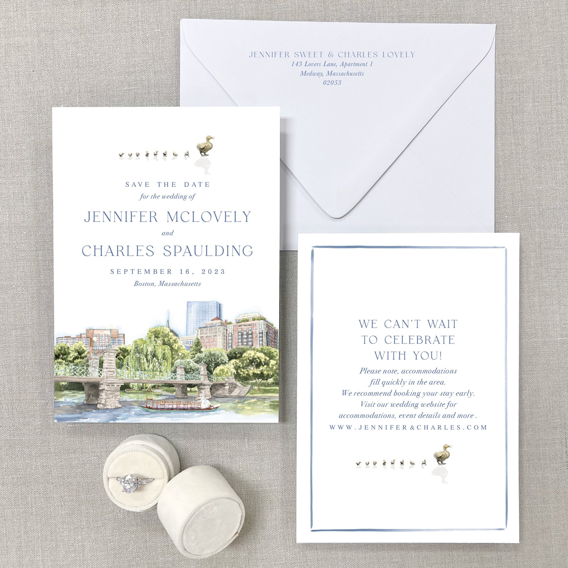 These lovely ladies are ready to order! Boston Gardens (Newbury or Four Seasons), Boston Massachusetts Watercolor Venue Save the Dates are at your door in as soon as 4 weeks . Ready to order save the dates are limited to the quantities and design options listed below. Please note, each layout has been designed to best showcase the watercolor venue and cannot be altered (placement of text, vertical/horizontal orientation etc). THE OPTIONS: Choose your Quantity- Sold in sets of 20, with 40 as the lowest quantity offered. Select quantity from first dropdown option below, leave second quantity at 1 (it indicates the set) Decide if you’d like blank envelopes or to include Envelope Addressing Once those two items are selected, the price above will adjust accordingly DESIGN OPTIONS: Scroll down to view the various options. You’ll indicate your selections in a pop-up form once you click “add to cart” Choose your font Choose your font color Choose your back design details Choose your envelope color