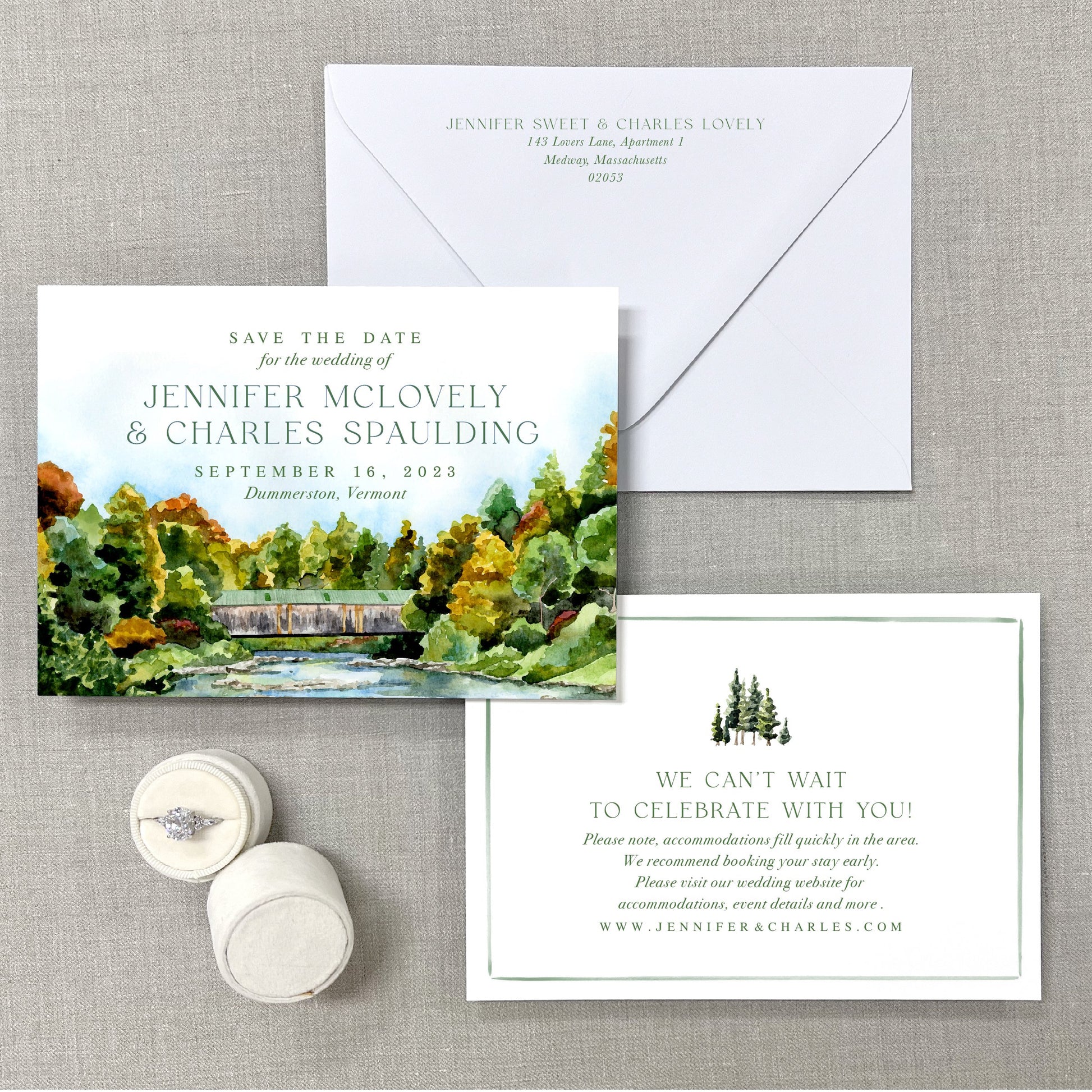 These lovely ladies are ready to order! Dummerston Vermont Covered Bridge, Vermont Watercolor Venue Save the Dates are at your door in as soon as 4 weeks . Ready to order save the dates are limited to the quantities and design options listed below. Please note, each layout has been designed to best showcase the watercolor venue and cannot be altered (placement of text, vertical/horizontal orientation etc). THE OPTIONS: Choose your Quantity- Sold in sets of 20, with 40 as the lowest quantity offered. Select quantity from first dropdown option below, leave second quantity at 1 (it indicates the set) Decide if you’d like blank envelopes or to include Envelope Addressing Once those two items are selected, the price above will adjust accordingly DESIGN OPTIONS: Scroll down to view the various options. You’ll indicate your selections in a pop-up form once you click “add to cart” Choose your font Choose your font color Choose your back design details Choose your envelope color