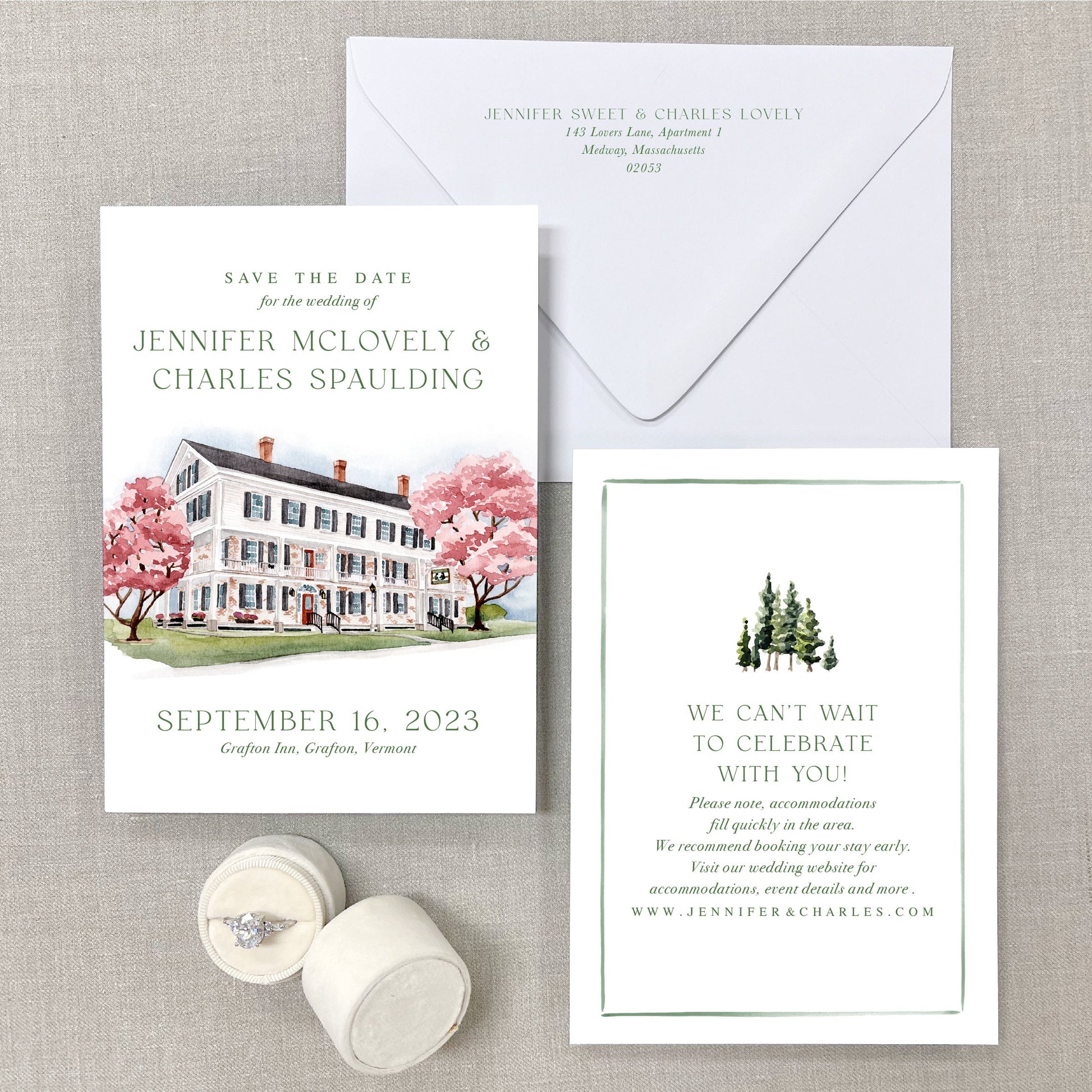 These lovely ladies are ready to order! Grafton Inn, Grafton, Vermont Watercolor Venue Save the Dates are at your door in as soon as 4 weeks . Ready to order save the dates are limited to the quantities and design options listed below. Please note, each layout has been designed to best showcase the watercolor venue and cannot be altered (placement of text, vertical/horizontal orientation etc). THE OPTIONS: Choose your Quantity- Sold in sets of 20, with 40 as the lowest quantity offered. Select quantity from first dropdown option below, leave second quantity at 1 (it indicates the set) Decide if you’d like blank envelopes or to include Envelope Addressing Once those two items are selected, the price above will adjust accordingly DESIGN OPTIONS: Scroll down to view the various options. You’ll indicate your selections in a pop-up form once you click “add to cart” Choose your font Choose your font color Choose your back design details Choose your envelope color