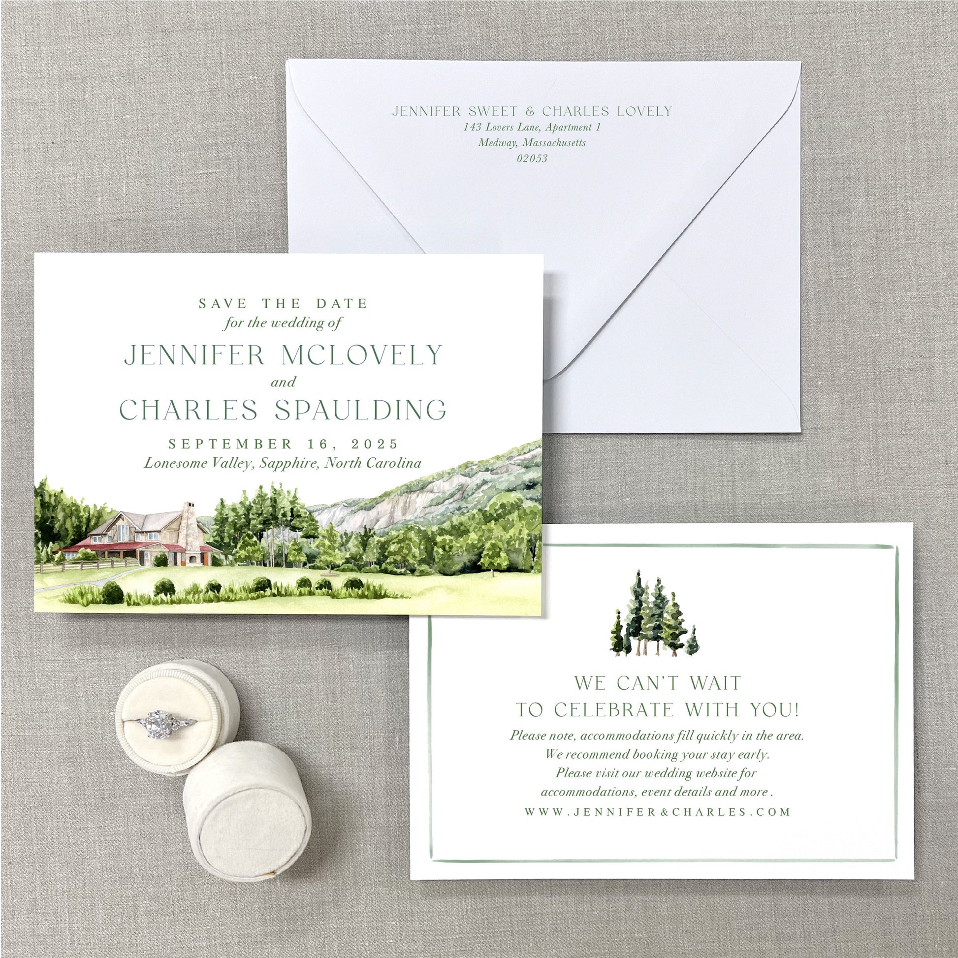 These lovely ladies are ready to order! Lonesome Valley, Sapphire, North Carolina, Watercolor Wedding Venue Save the Dates are at your door in as soon as 4 weeks . Ready to order save the dates are limited to the venues, quantities and design options listed below. Please note, each layout has been designed to best showcase the watercolor venue and cannot be altered (placement of text, vertical/horizontal orientation etc). THE OPTIONS: Choose your Quantity- Sold in sets of 20, with 40 as the lowest quantity offered. Select quantity from first dropdown option below, leave second quantity at 1 (it indicates the set) Decide if you’d like blank envelopes or to include Envelope Addressing Once those two items are selected, the price above will adjust accordingly DESIGN OPTIONS: Scroll down to view the various options. You’ll indicate your selections in a pop-up form once you click “add to cart” Choose your font Choose your font color Choose your back design details Choose your envelope color
