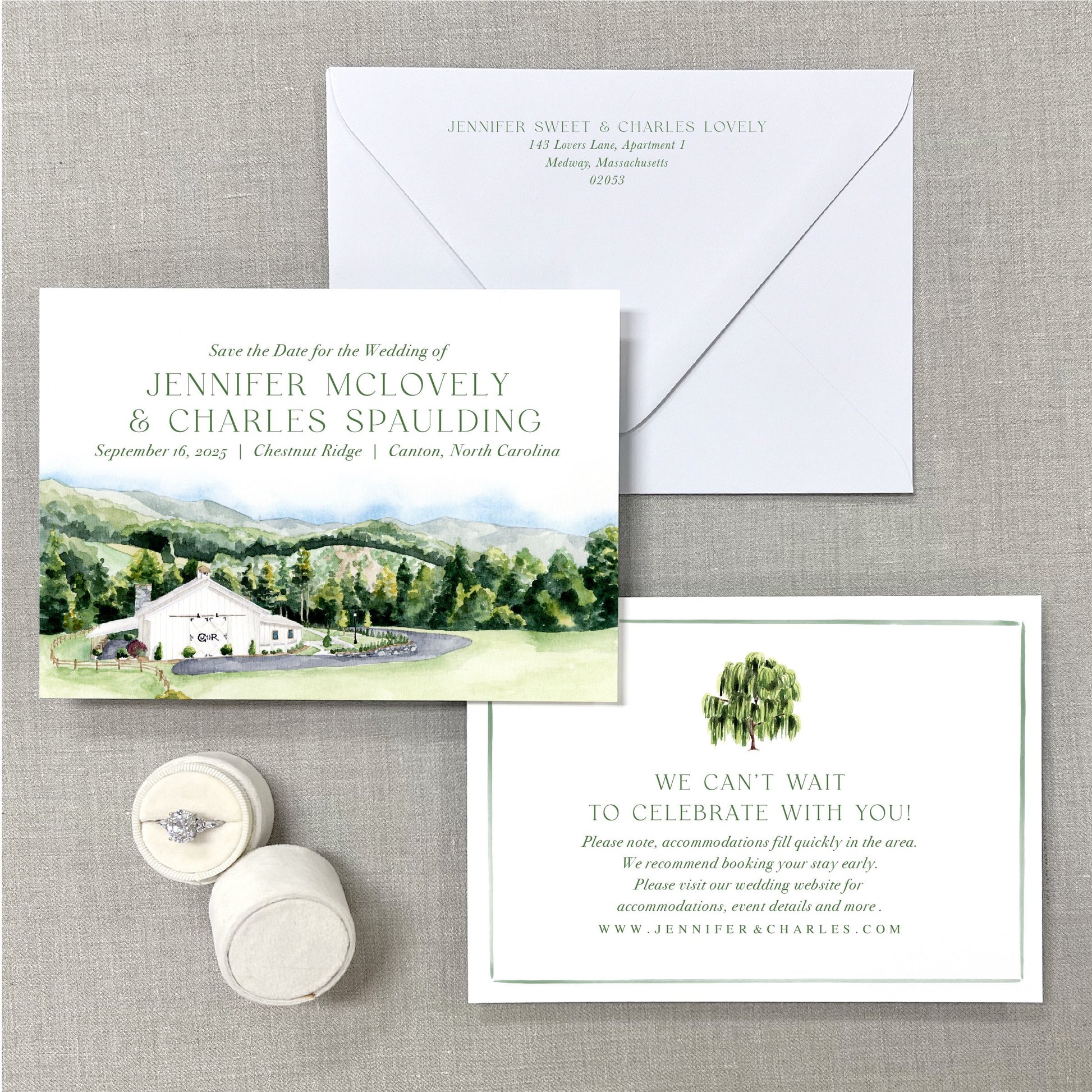 Chestnut Ridge, Canton, North Carolina, Watercolor Wedding Venue Save The Dates