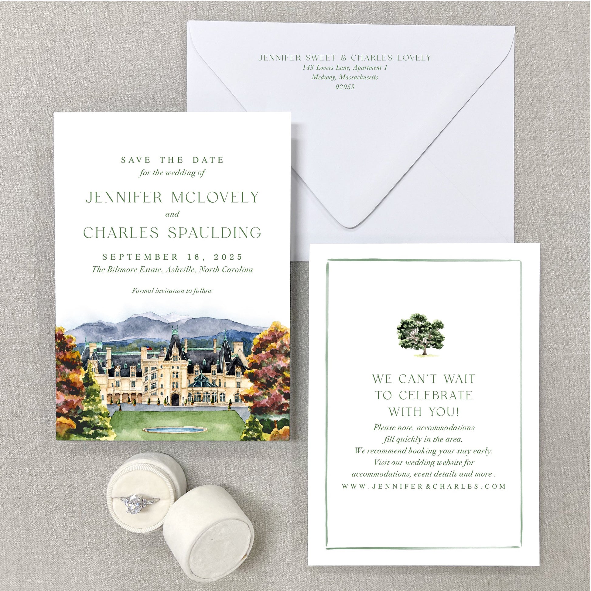 These lovely ladies are ready to order! Biltmore Estate, Asheville, North Carolina, Watercolor Wedding Venue Save the Dates are at your door in as soon as 4 weeks . Ready to order save the dates are limited to the venues, quantities and design options listed below. Please note, each layout has been designed to best showcase the watercolor venue and cannot be altered (placement of text, vertical/horizontal orientation etc). THE OPTIONS: Choose your Quantity- Sold in sets of 20, with 40 as the lowest quantity offered. Select quantity from first dropdown option below, leave second quantity at 1 (it indicates the set) Decide if you’d like blank envelopes or to include Envelope Addressing Once those two items are selected, the price above will adjust accordingly DESIGN OPTIONS: Scroll down to view the various options. You’ll indicate your selections in a pop-up form once you click “add to cart” Choose your font Choose your font color Choose your back design details Choose your envelope color