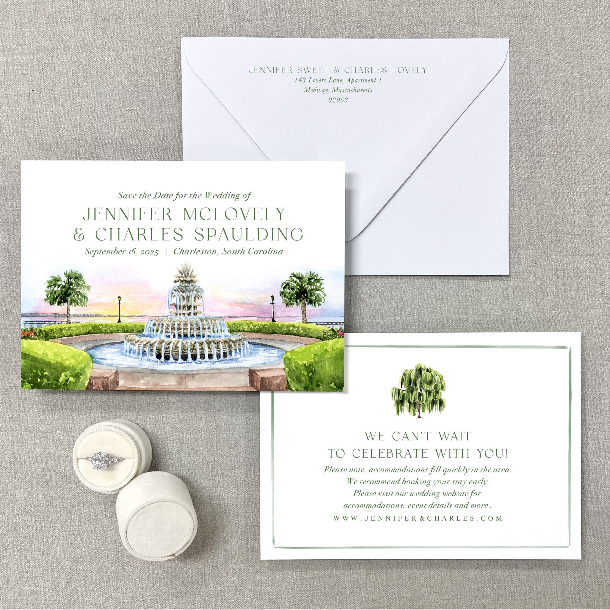 Charleston Pineapple Fountain, South Carolina, Watercolor Wedding Venue Save The Dates