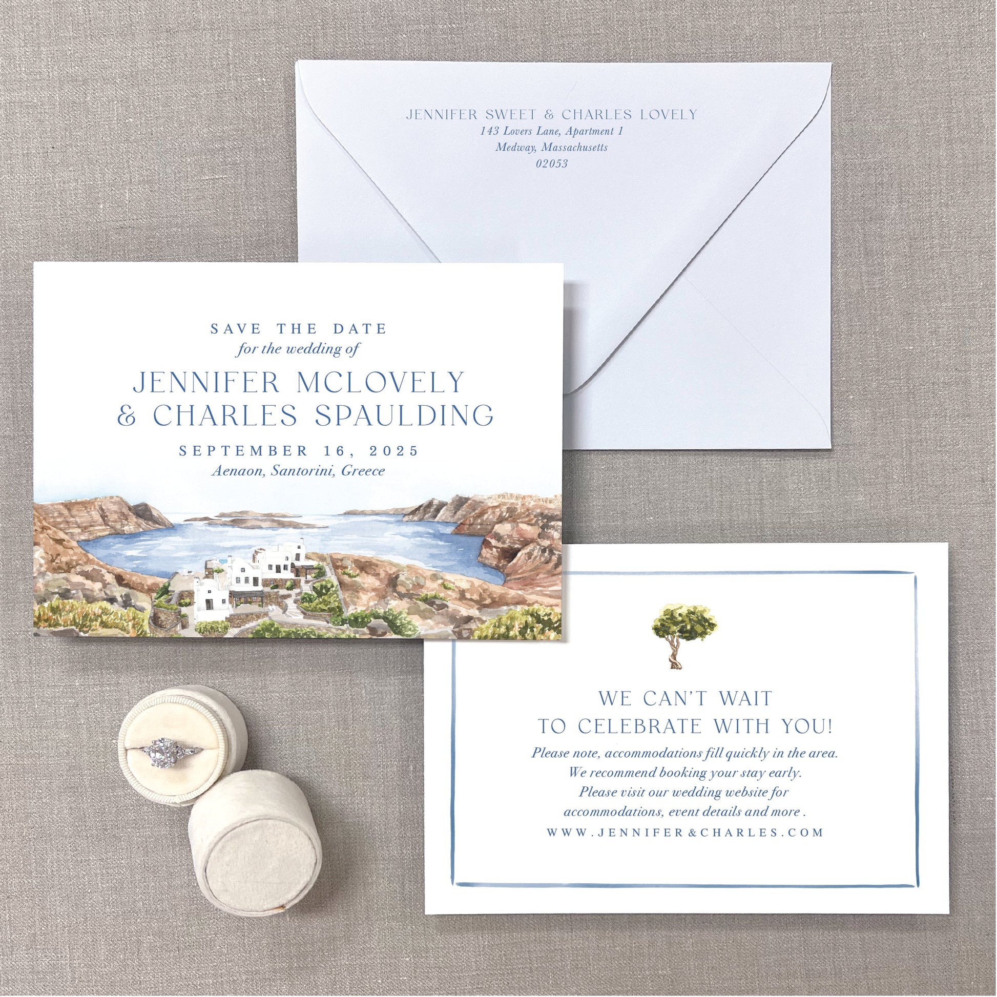 These lovely ladies are ready to order! Aenaon Villas, Santorini, Greece, Watercolor Venue Save the Dates are at your door in as soon as 4 weeks . Ready to order save the dates are limited to the quantities and design options listed below. Please note, each layout has been designed to best showcase the watercolor venue and cannot be altered (placement of text, vertical/horizontal orientation etc). THE OPTIONS: Choose your Quantity- Sold in sets of 20, with 40 as the lowest quantity offered. Select quantity from first dropdown option below, leave second quantity at 1 (it indicates the set) Decide if you’d like blank envelopes or to include Envelope Addressing Once those two items are selected, the price above will adjust accordingly DESIGN OPTIONS: Scroll down to view the various options. You’ll indicate your selections in a pop-up form once you click “add to cart” Choose your font Choose your font color Choose your back design details Choose your envelope color