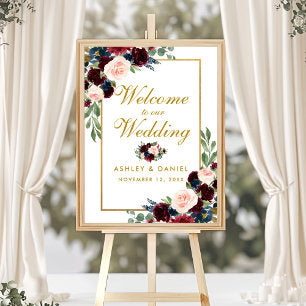 Burgundy Blue Gold Floral Wedding Welcome Poster