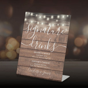 Rustic Wood String Lights Wedding Signature Drinks Pedestal Sign