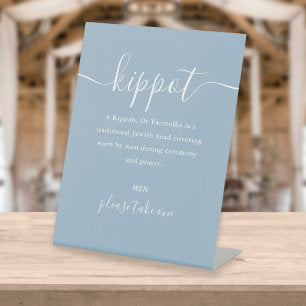 Dusty Blue Jewish Wedding Kippot Script Yarmulke Pedestal Sign