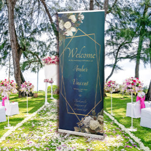 Modern Floral Gold Emerald Green Wedding Welcome Retractable Banner