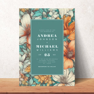Retro Floral Vintage Botanical Teal Orange Wedding Invitation