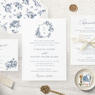 Elegant French Roses Floral Blue Crest Wedding Invitation