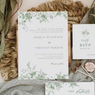 Sage Green Toile Vintage Floral Wedding Invitation