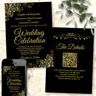 Gold Filigree on Black Elegant QR Code Wedding Invitation