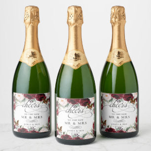 Burgundy Blush Floral Wedding Gold Butterflies Sparkling Wine Label